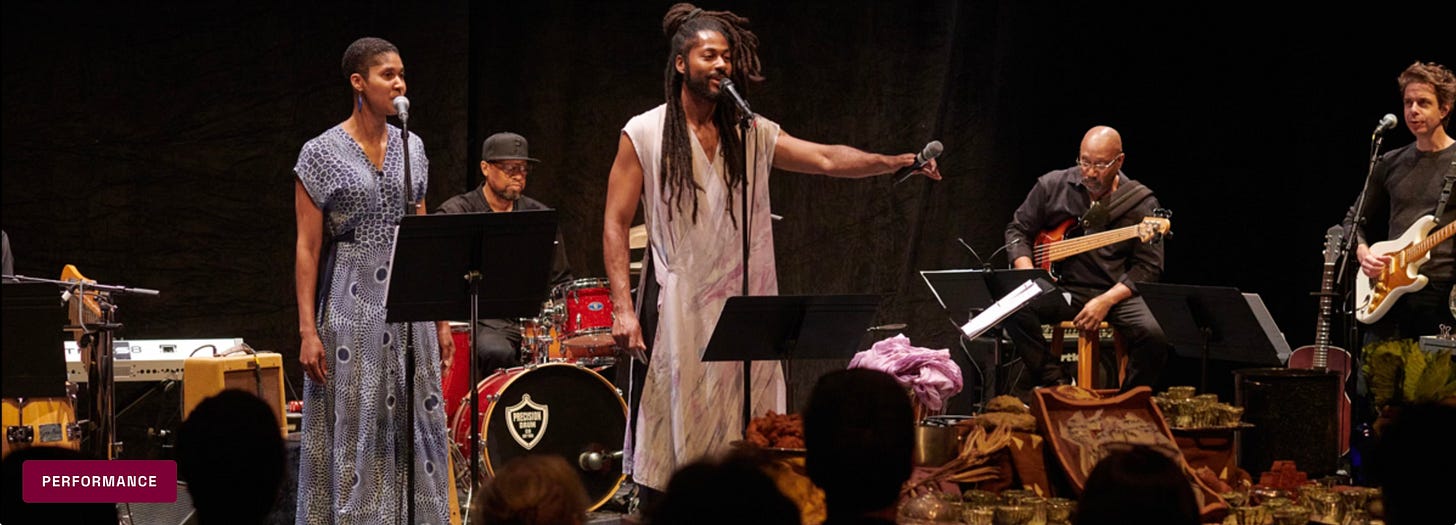 COMMUNION (C7M7N) is a participatory “blues Eucharist” inspired by the artists’ early experiences in the Black Protestant churches of his childhood in the Southeast region of the United States. In collaboration with chef and artist Omar Tate (featured in the Netflix series High on the Hog), food and culture writer Osayi Endolyn (The Rise: Black Cooks and the Soul of American Food: A Cookbook), and visual artist Ambrose Rhapsody Murray, COMMUNION began as an offering to the audience, with poems, prayers, movement, music, and food. The ritual applies the distinct paradox which imbues a Eucharistic meal: the partaking of which is simultaneously a commemoration of death as well as a claim of unity with that which cannot die or be diminished. COMMUNION seeks to construct new spaces and traditions of testimony and witness.”